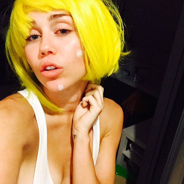 In the photos, the pop star dons a series of brightly colored wigs and has a couple dots of zit cream on her face. The only problem this time, however, was that in one of the snapshots, Cyrus’s left nipple was partially